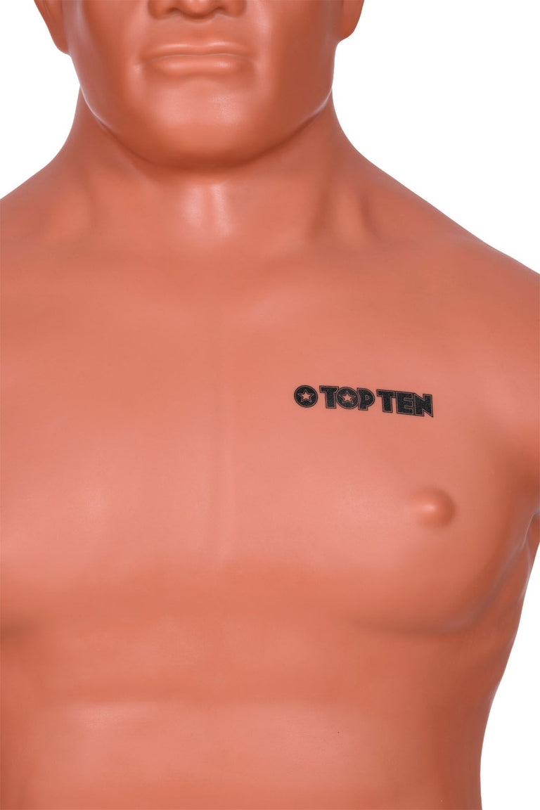Met een basisdiameter van slechts 57 cm neemt de “Punch Bro” nauwelijks ruimte in beslag, maar biedt hij je een 360° vechtsportervaring van topklasse. Van het hoofd tot het aangeduide onderlichaam is hij bedekt met een duurzame, elastische rubberen laag. De 5 mm dikke hoes geeft een realistisch stootgevoel en reproduceert menselijke details indrukwekkend realistisch. Ogen, nek en het aangeduide onderlichaam maken de TOP TEN dummy bijzonder waardevol voor zelfverdedigingstraining.