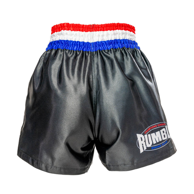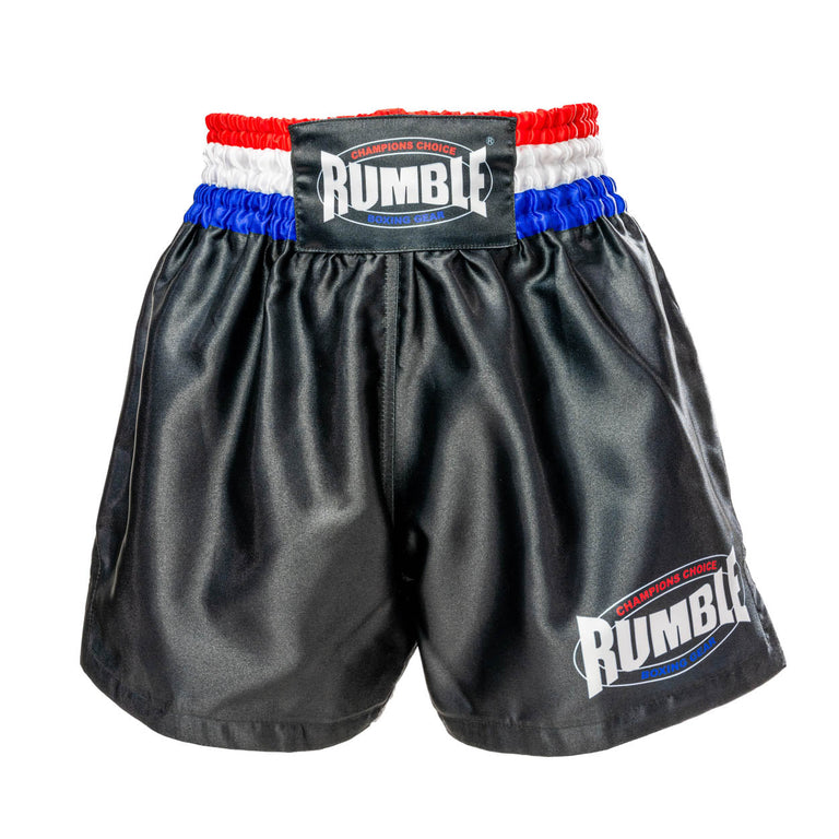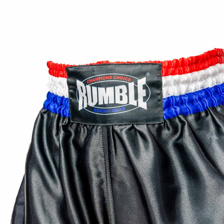 Kickboksshort van Rumble Boxing Gear in in zwart met accenten rood/wit/blauw! Dit model heeft een elastieke band met een touwtje aan de binnenkant voor optimale pasvorm.