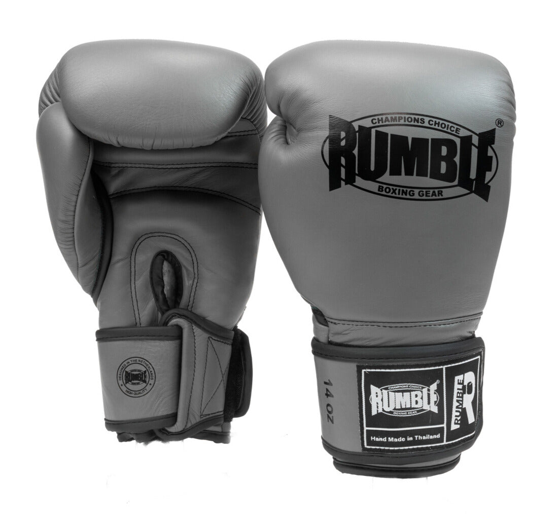 Bokshandschoen Rumble Exclusive Grijs zijn van echt leer en handgemaakt in Thailand. De handschoenen bevatten meerdere lagen padding met hoge en lage dichtheid voor ultieme protectie.
